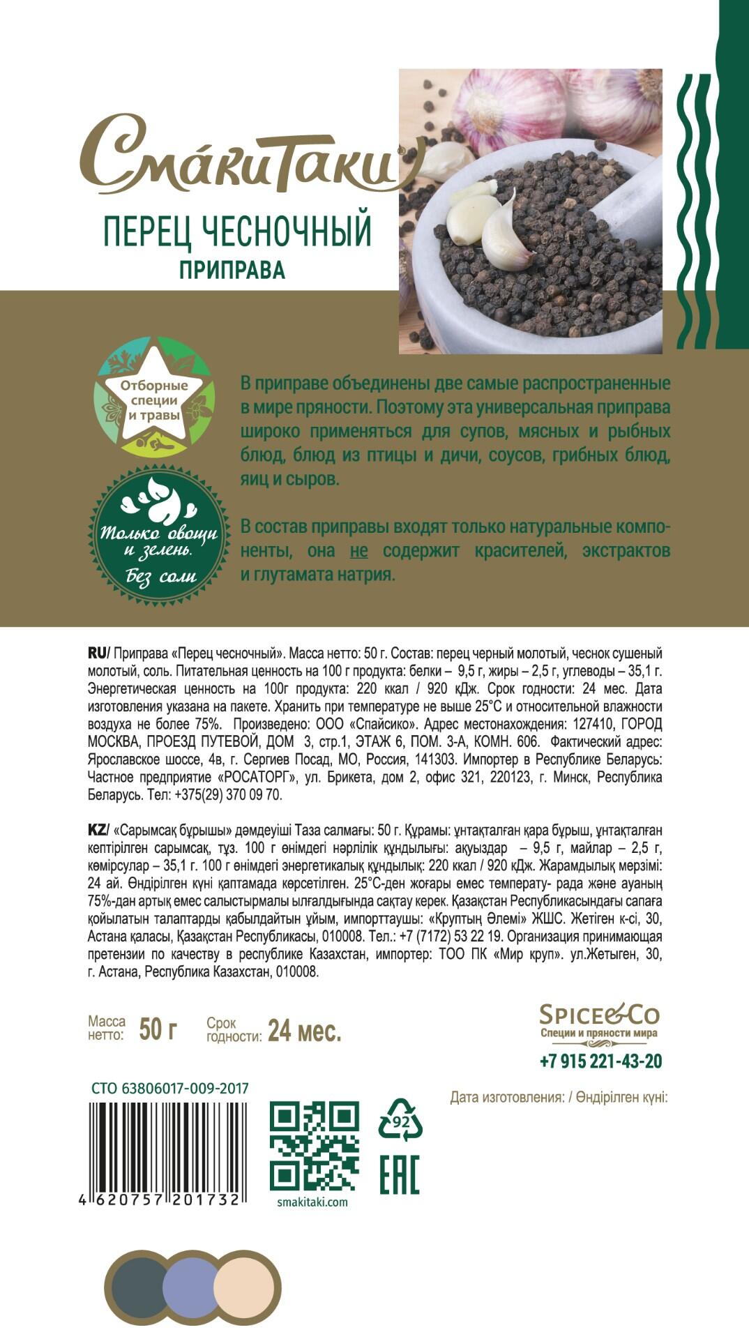 Состав: перец черный молотый, чеснок сушеный молотый, соль. Питательная ценность на 100 г продукта: белки — 8,5 г, жиры — 2,5 г, углеводы — 35,1 г. Энергетическая ценность на 100г продукта: 220 ккал / 920 кДж. Хранить при температуре не выше +25° С и относительной влажности воздуха не более 75%.