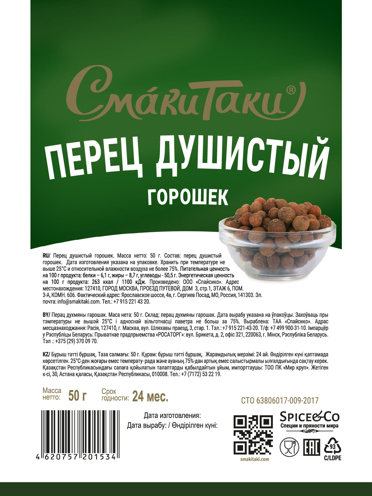 Состав: перец душистый горошек. Питательная ценность на 100 г продукта: белки — 6,1 г, жиры — 8,7 г, углеводы — 50,5 г. Энергетическая ценность на 100 г продукта: 263 ккал / 1100 кДж. Хранить при температуре не выше 25°С и относительной влажности воздуха не более 75%.