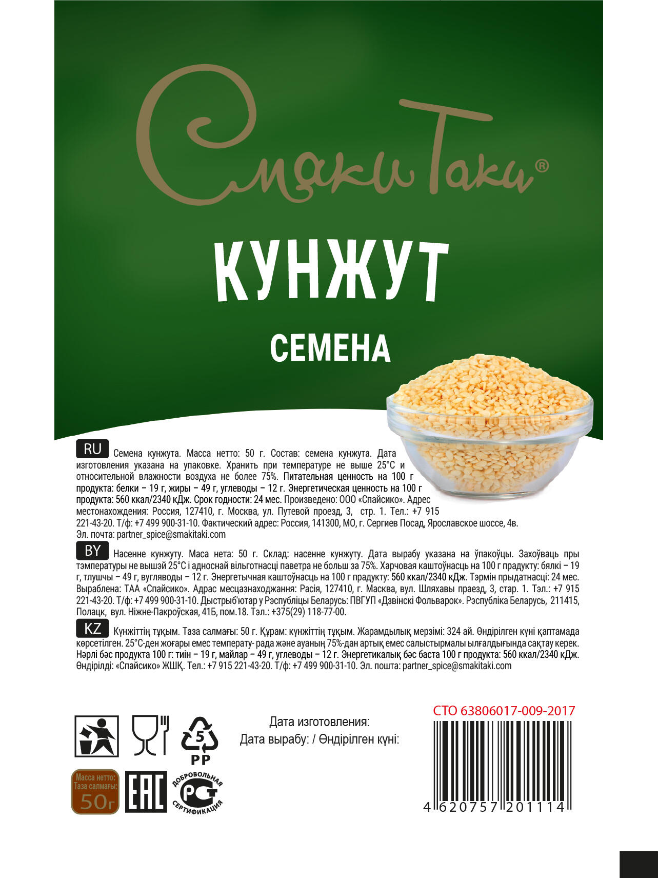 Состав: семена кунжута. Питательная ценность на 100 г продукта: белки — 19 г, жиры — 49 г, углеводы — 12 г. Энергетическая ценность на 100 г продукта: 560 ккал/2340 кДж. Хранить при температуре не выше 25°С и относительной влажности воздуха не более 75%.