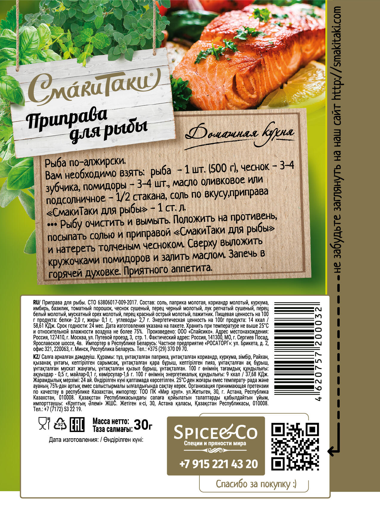 Состав: соль, паприка молотая, кориандр молотый, куркума, имбирь, базилик, томатный порошок, чеснок сушеный, перец черный молотый, лук репчатый сушеный, перец белый молотый, мускатный орех молотый, перец красный острый молотый, пажитник. Пищевая ценность на 100 г продукта: белки- 2,0 г, жиры- 0,1 г, углеводы- 2,7 г. энергетическая ценность на 100г продукта: 14 ккал / 58,61 КДж. Хранить при температуре не выше 25°С и относительной влажности воздуха не более 75%.