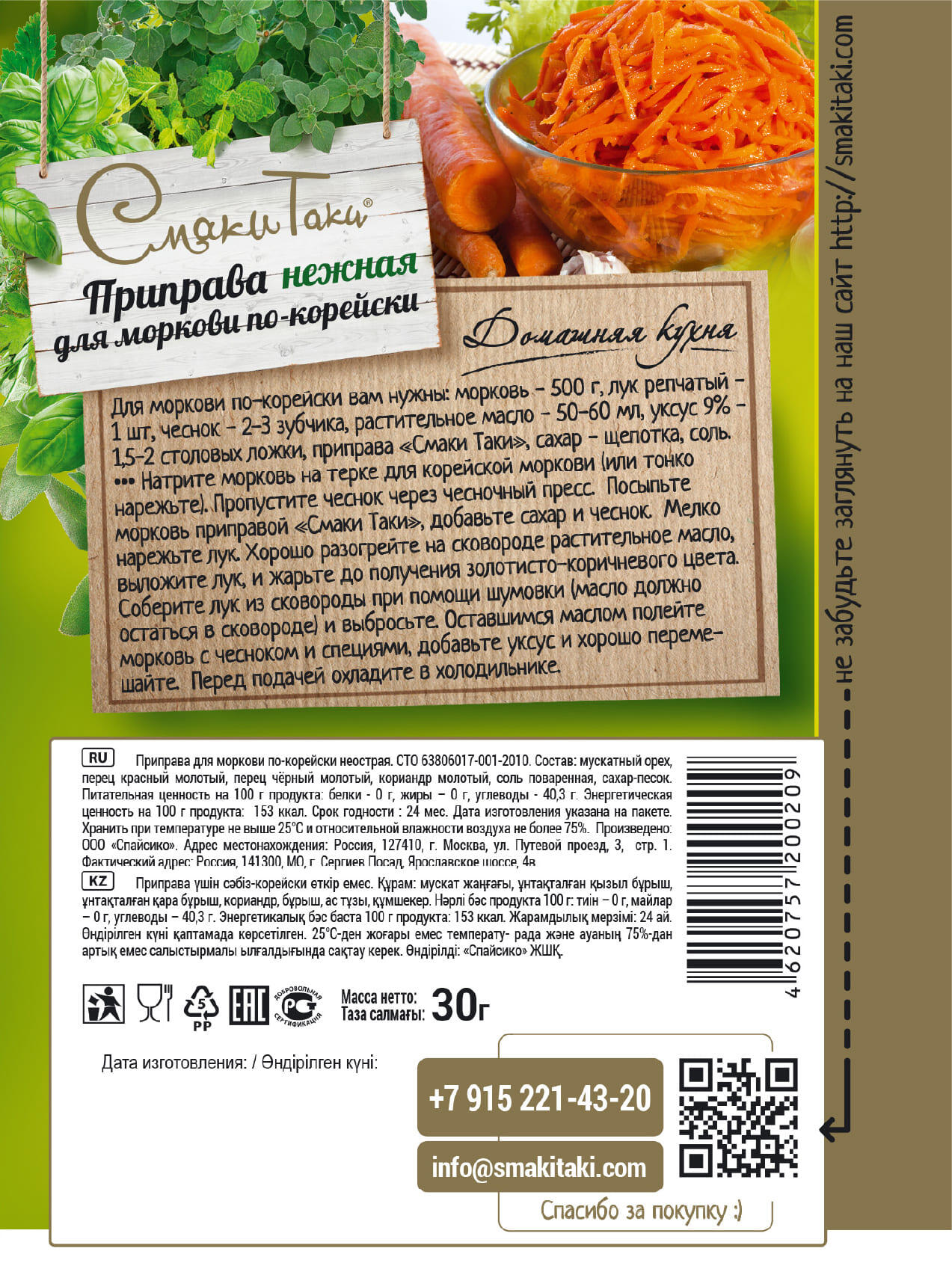 Состав: мускатный орех, перец красный молотый, перец чёрный молотый, кориандр молотый, соль поваренная, сахар-песок. Питательная ценность на 100 г продукта: белки — 0 г, жиры — 0 г, углеводы — 40,3 г. Энергетическая ценность на 100 г продукта: 153 ккал. Хранить при температуре не выше 25°С и относительной влажности воздуха не более 75%.