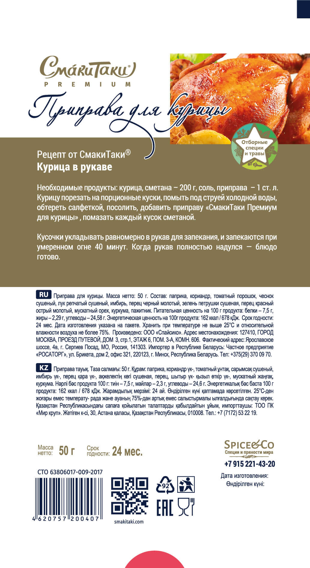 Состав: паприка, кориандр, томатный порошок, чеснок сушеный, лук репчатый сушеный, имбирь, перец черный молотый, зелень петрушки сушеная, перец красный острый молотый, мускатный орех, куркума, пажитник. Питательная ценность на 100 г продукта: белки — 7,5 г, жиры — 2,29 г, углеводы — 24,58 г. Энергетическая ценность на 100г продукта: 162 ккал / 678 кДж. Хранить при температуре не выше 25°С и относительной влажности воздуха не более 75%.