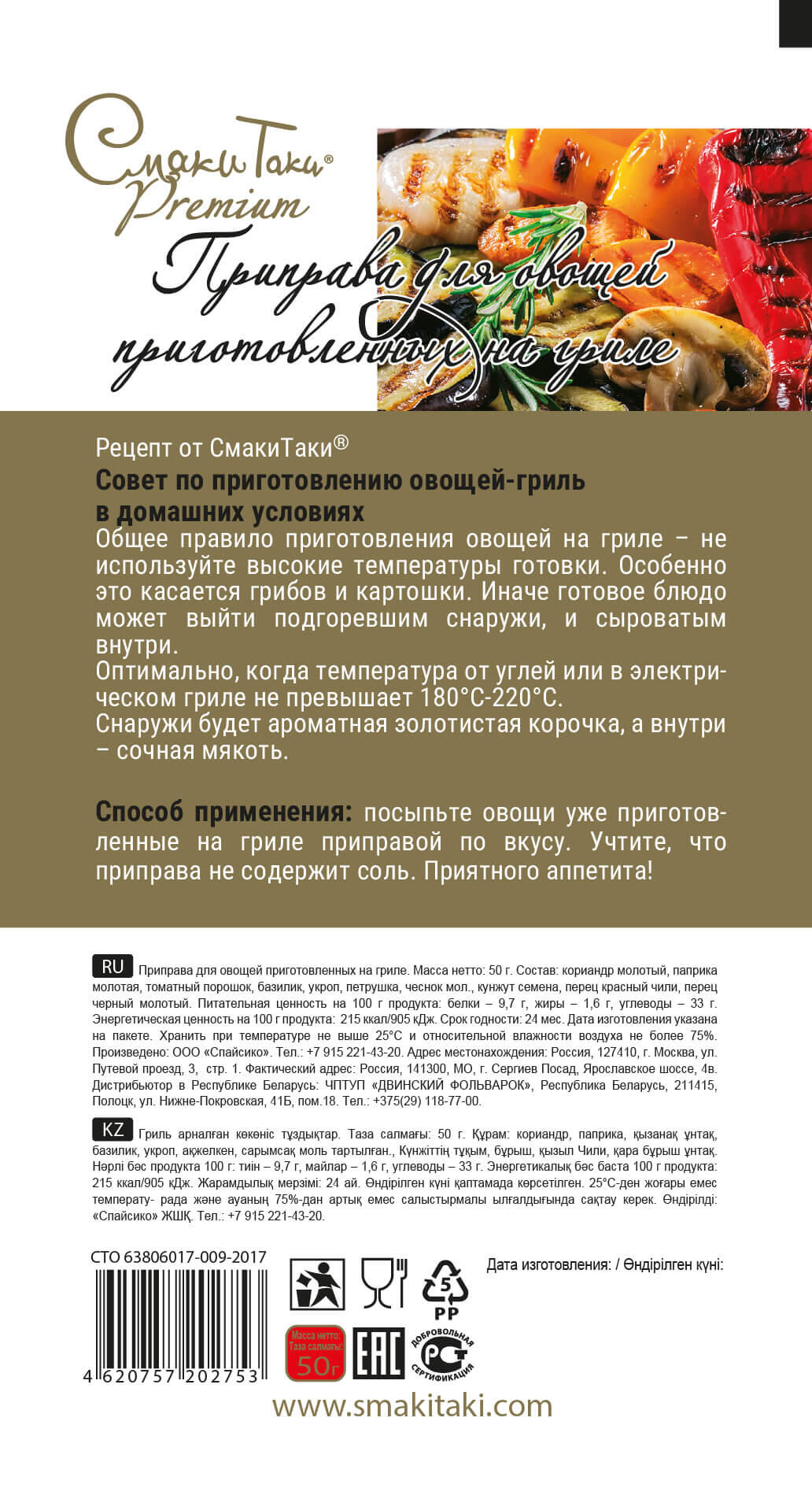 Состав: кориандр молотый, паприка молотая, томатный порошок, базилик, укроп, петрушка, чеснок мол., кунжут семена, перец красный чили, перец черный молотый. Питательная ценность на 100 г продукта: белки — 9,7 г, жиры — 1,6 г, углеводы — 33 г. Энергетическая ценность на 100 г продукта: 215 ккал/905 кДж. Хранить при температуре не выше 25°С и относительной влажности воздуха не более 75%.