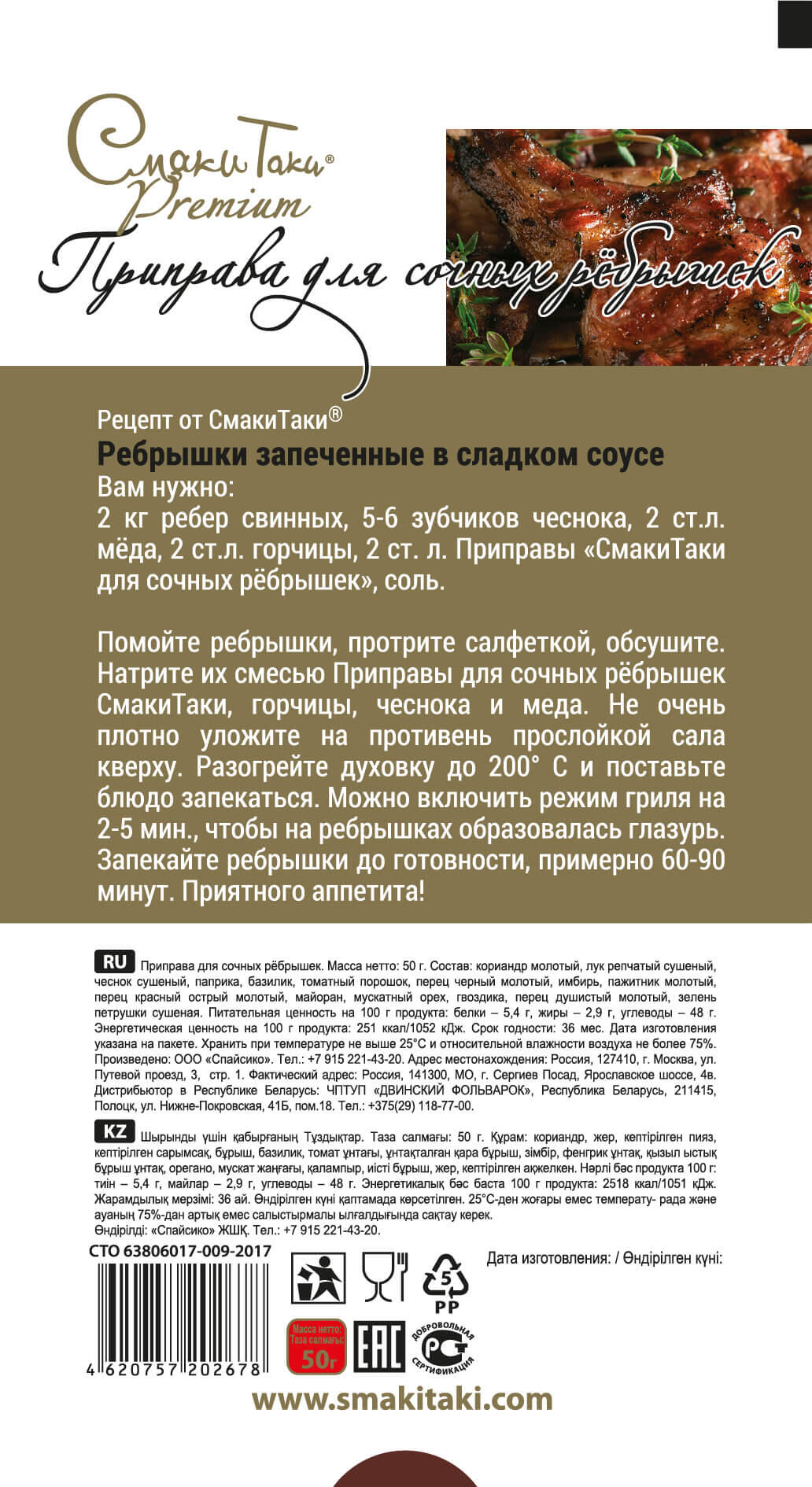 Состав: кориандр молотый, лук репчатый сушеный, чеснок сушеный, паприка, базилик, томатный порошок, перец черный молотый, имбирь, пажитник молотый, перец красный острый молотый, майоран, мускатный орех, гвоздика, перец душистый молотый, зелень петрушки сушеная. Питательная ценность на 100 г продукта: белки — 5,4 г, жиры — 2,9 г, углеводы — 48 г. Энергетическая ценность на 100 г продукта: 251 ккал/1052 кДж. Хранить при температуре не выше 25°С и относительной влажности воздуха не более 75%.