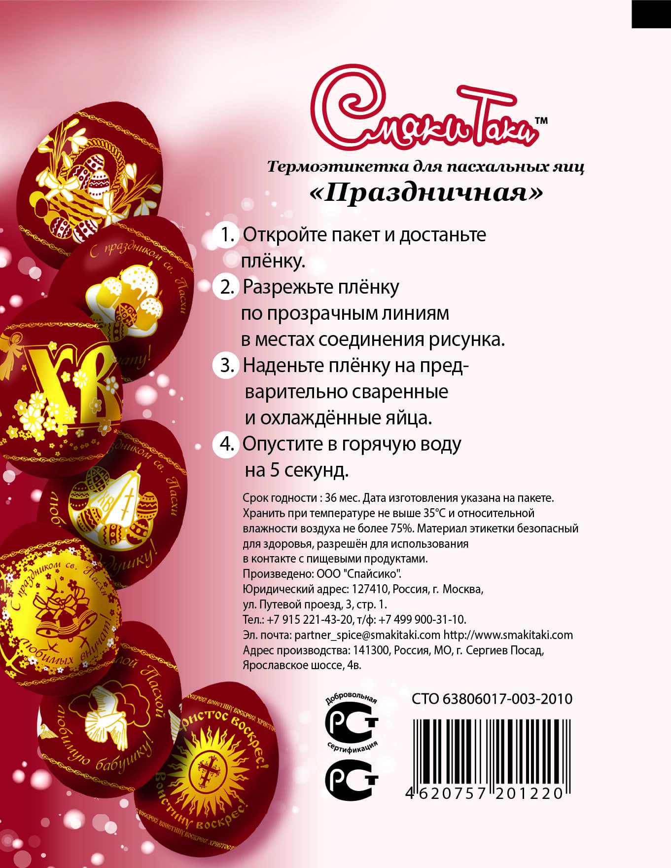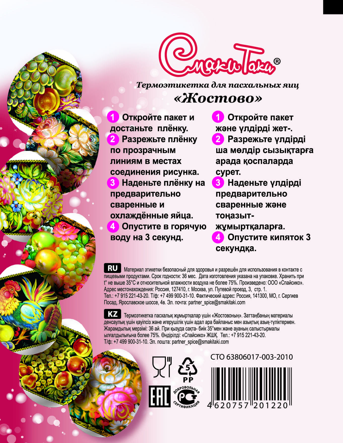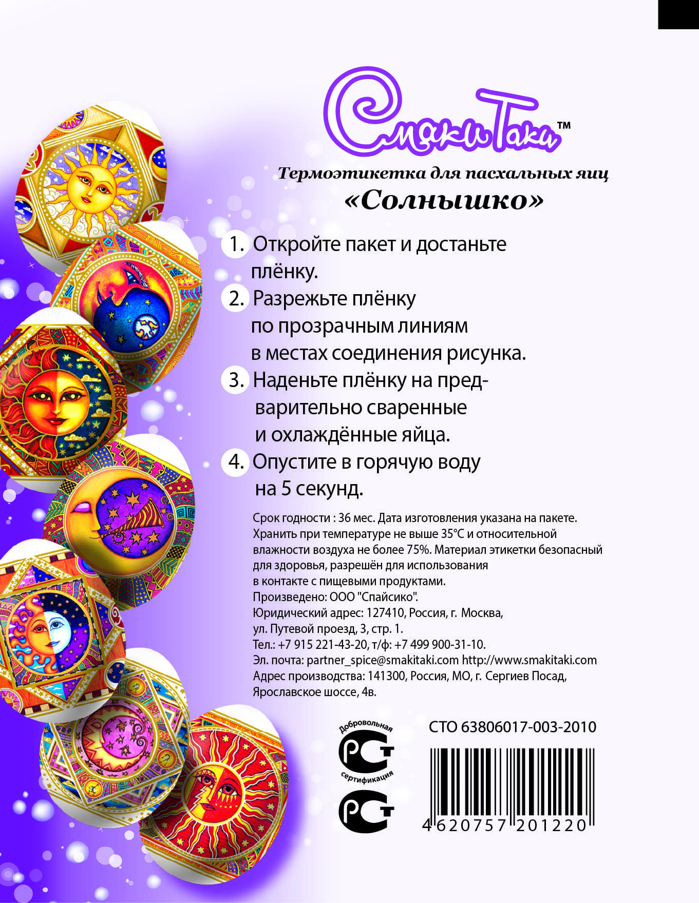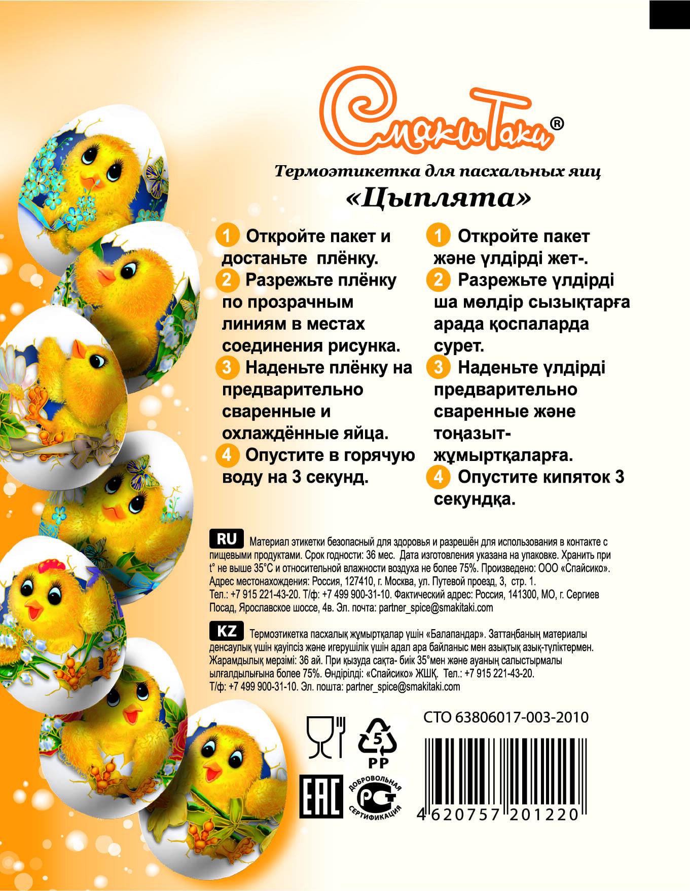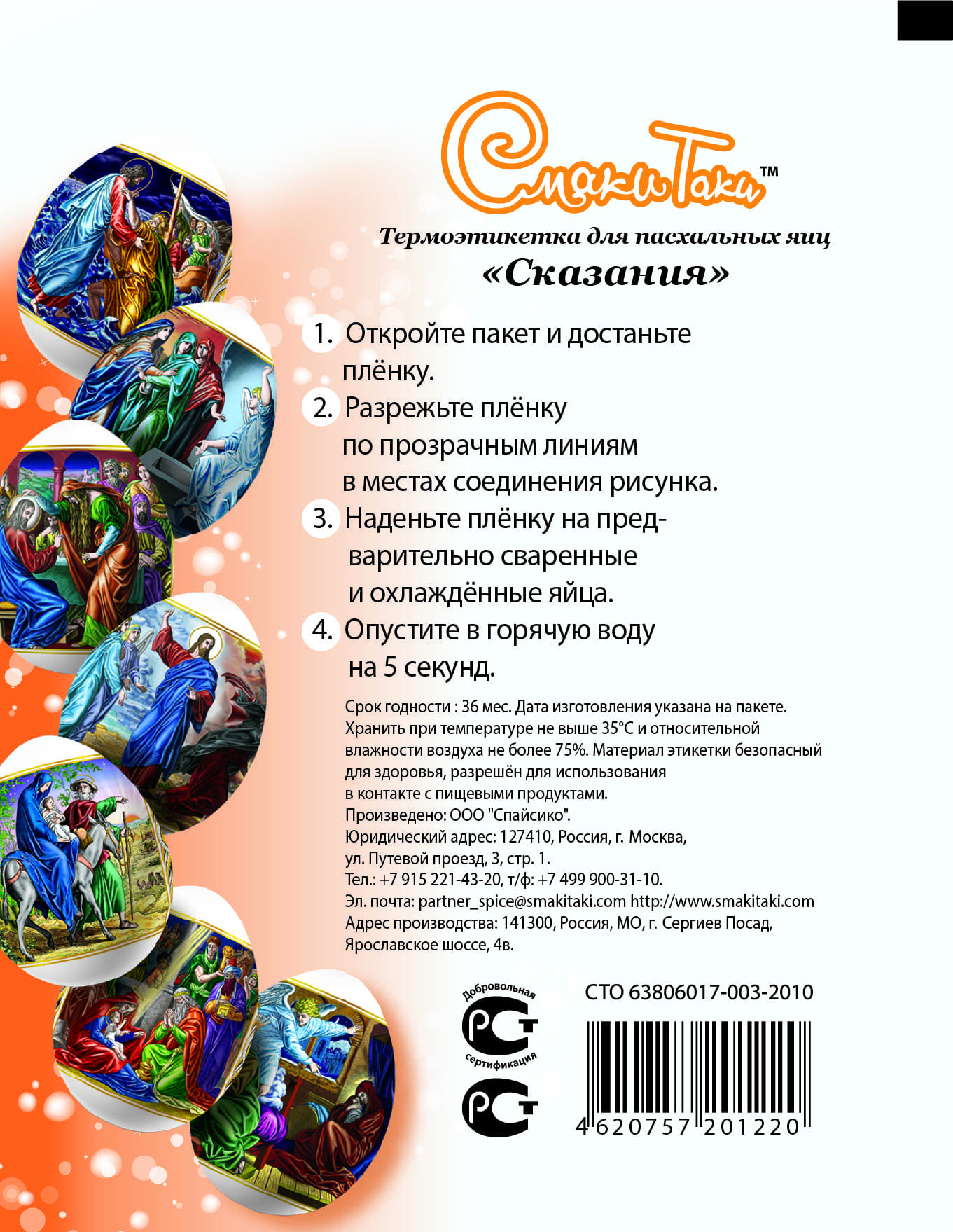 Наденьте плёнку на предварительно сваренные и охлаждённые яйца. Опустите в горячую воду на 3 секунд. Хранить при t° не выше 20°С и относительной влажности воздуха не более 75%. Материал этикетки безопасный для здоровья, разрешен для использования в контакте с пищевыми продуктами.