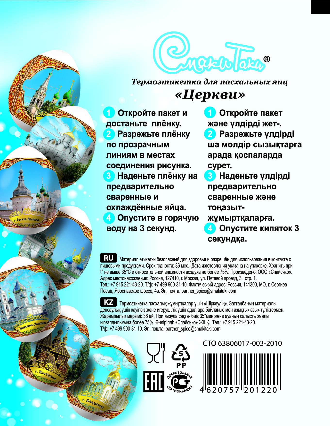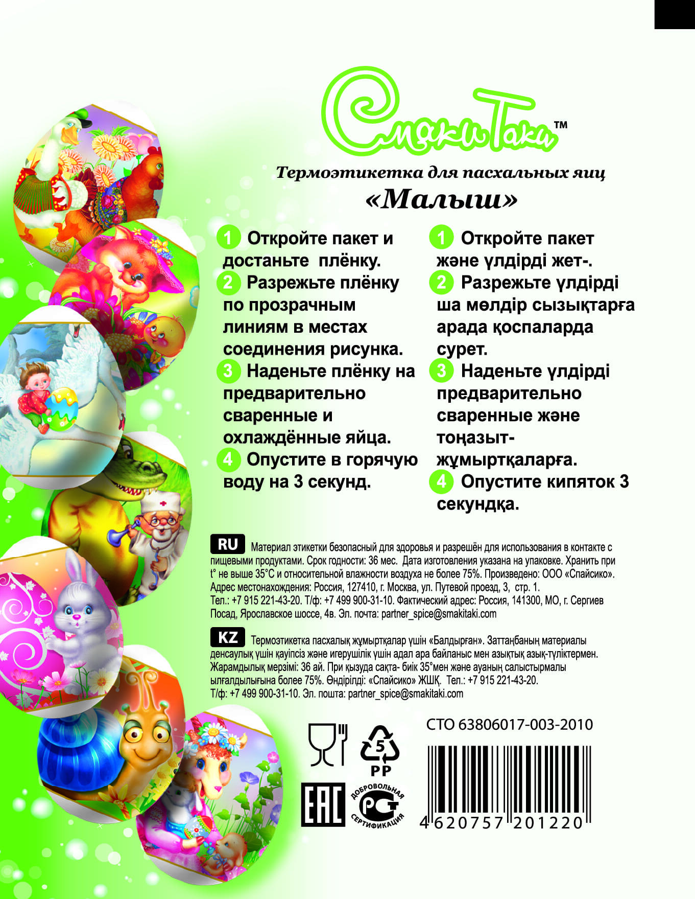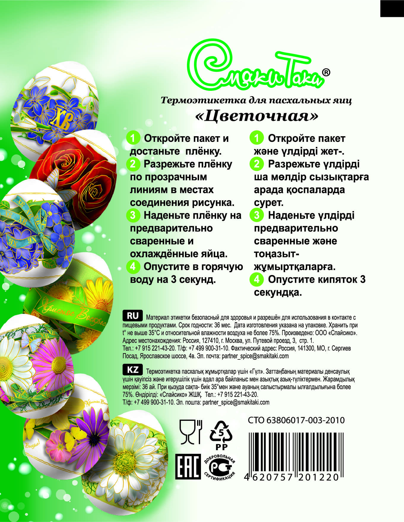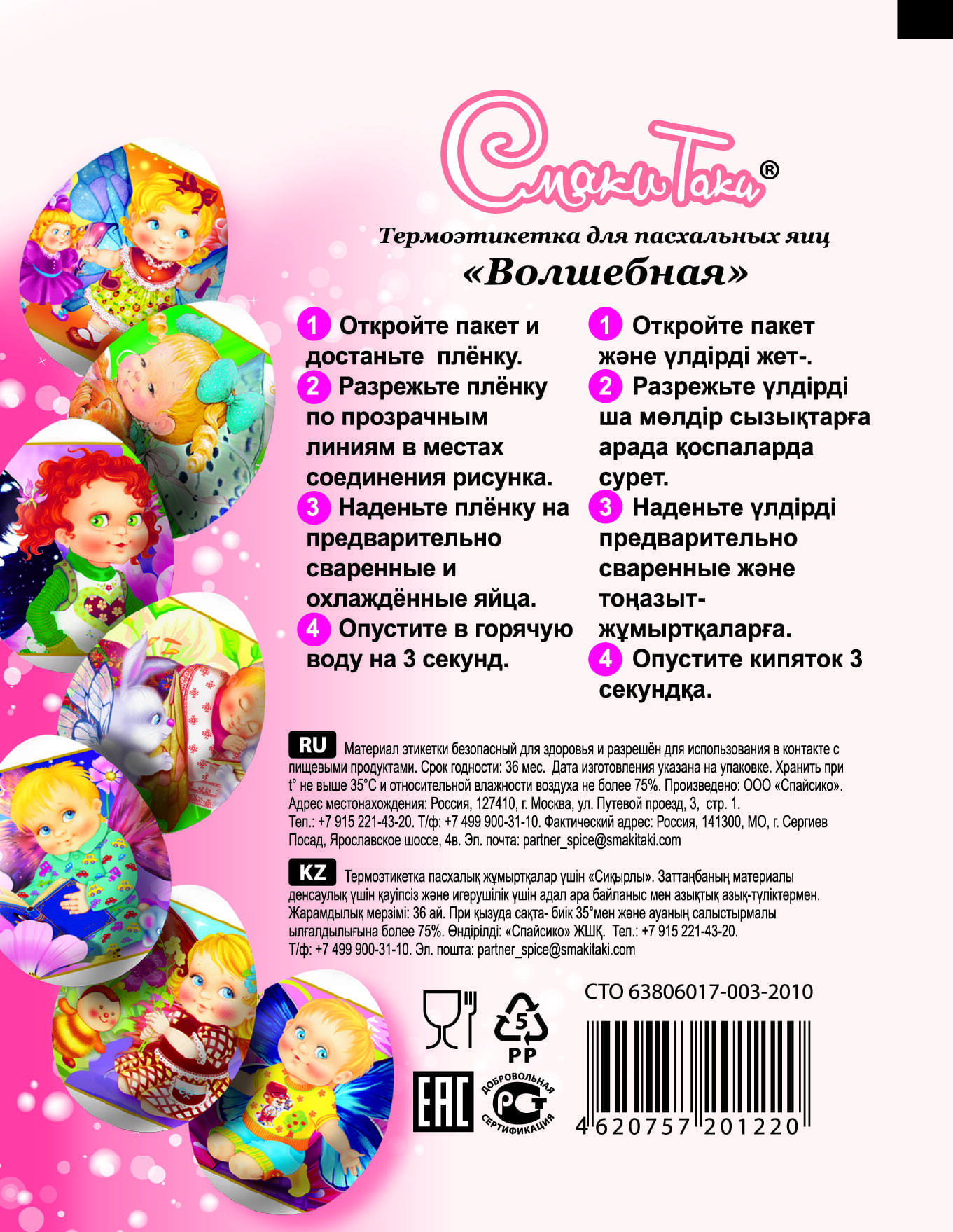 Наденьте плёнку на предварительно сваренные и охлаждённые яйца. Опустите в горячую воду на 3 секунд. Хранить при t° не выше 20°С и относительной влажности воздуха не более 75%. Материал этикетки безопасный для здоровья, разрешен для использования в контакте с пищевыми продуктами.
