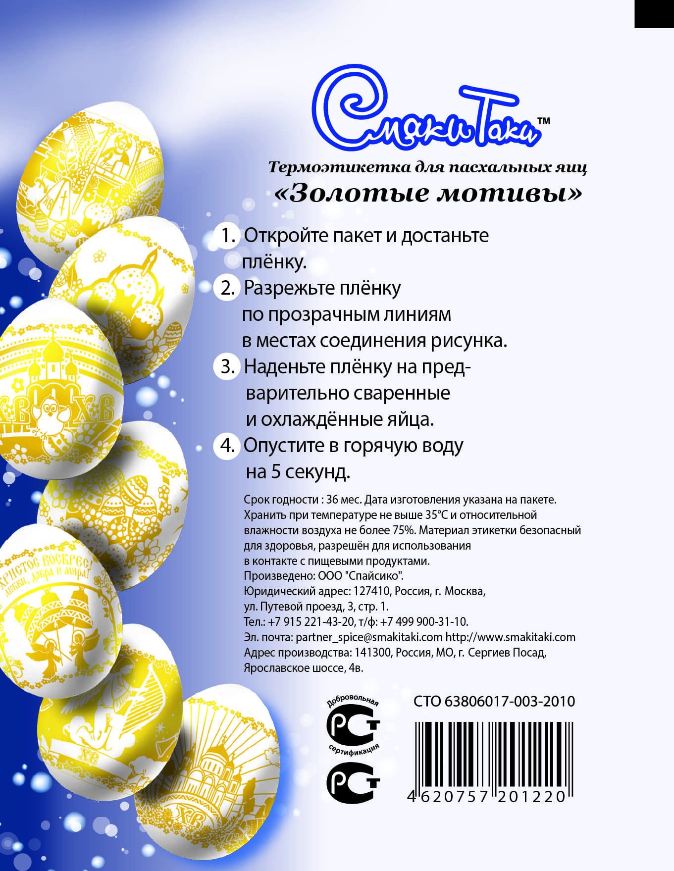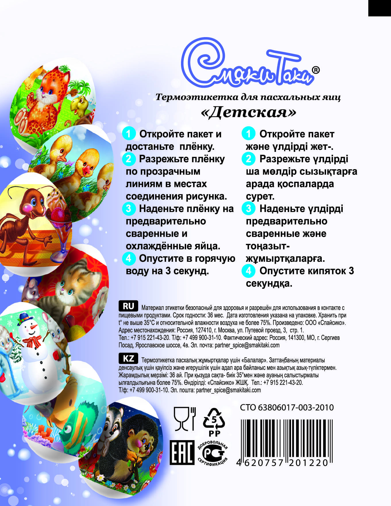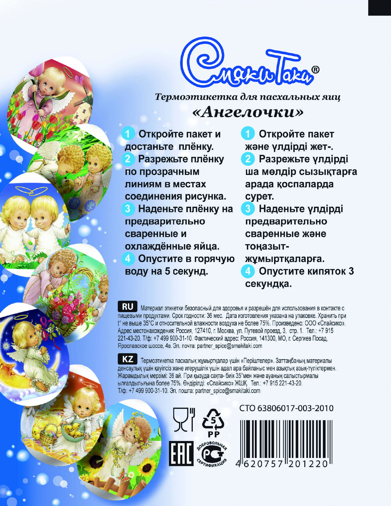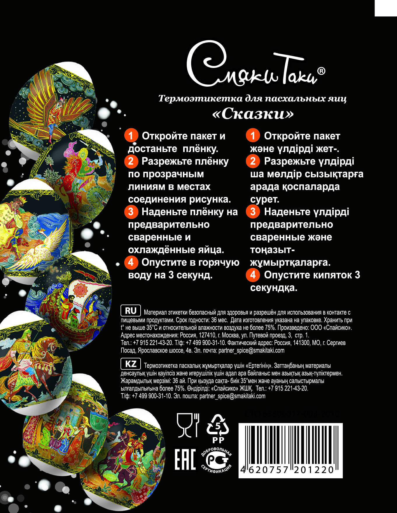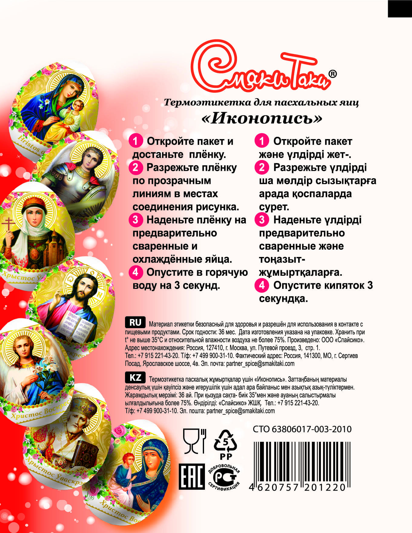 Наденьте плёнку на предварительно сваренные и охлаждённые яйца. Опустите в горячую воду на 3 секунд. Хранить при t° не выше 20°С и относительной влажности воздуха не более 75%. Материал этикетки безопасный для здоровья, разрешен для использования в контакте с пищевыми продуктами.