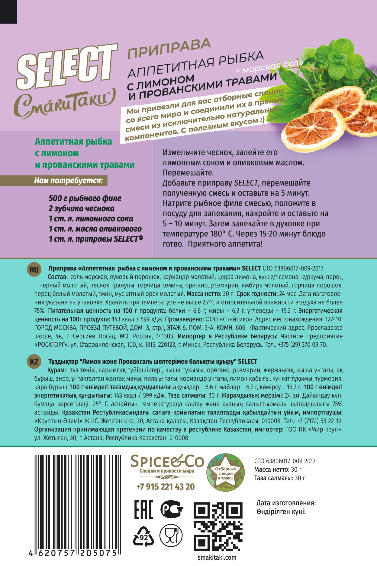 Состав: соль морская, пуковый порошок, кориандр молотый, цедра лимона, кунжут семена, куркума, перец черный молотый, чеснок гранулы, горчица семена, орегано, розмарин, имбирь молотый, горчица порошок, перец белый молотый, тмин, мускатный орех молотый. Питательная ценность на 100 г продукта: белки — 6,6 г, жиры — 6,2 с углеводы — 15,2 г. Энергетическая ценность на 100г продукта: 143 ккал / 599 кДж. Хранить при температуре не выше 25°С и относительной влажности воздуха не более 75%.