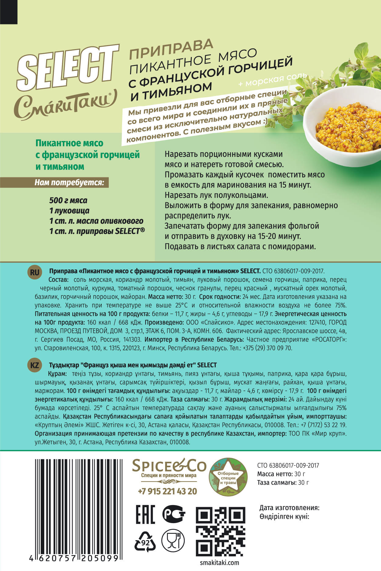 Состав: соль морская, кориандо молотый, тимьян, луковый порошок, семена горчицы, паприка, перец черный молотый, куркума, томатный порошок, чеснок гранулы, перец красный, мускатный орех молотый, базилик, горчичный порошок, майоран. Хранить при температуре не выше 25 С и относительной влажности воздуха не более 75% Питательная ценность на 100 г продукта: белки — 11,7 с, жиры — 4,0 с, углеводы — 17,9 г. Энергетическая ценность на 100г продукта: 160 ккал / 668 кДж.