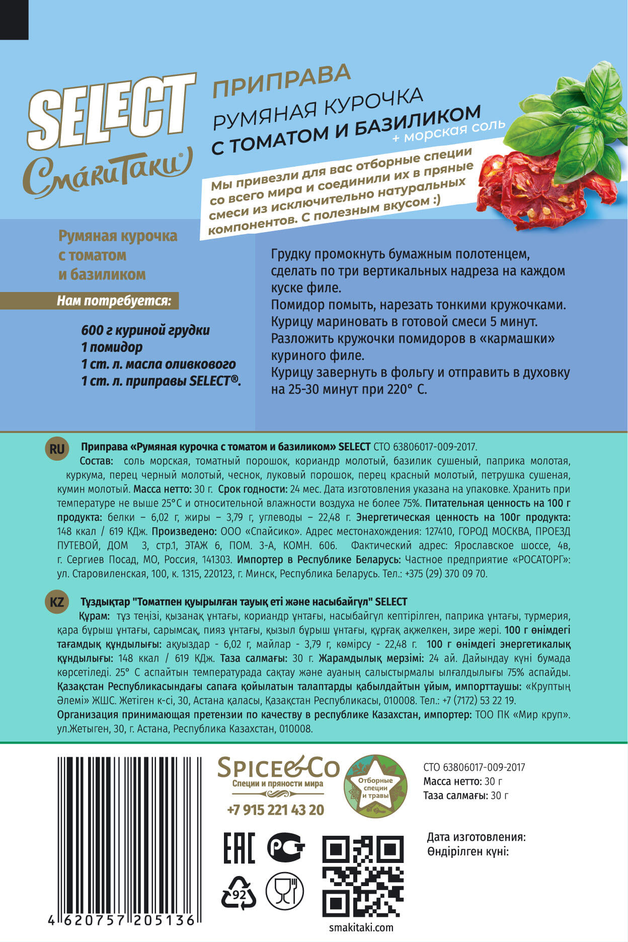 Состав: соль морская, томатный порошок, кориандр молотый, базилик сушеный, паприка молотая, куркума, перец черный молотый, чеснок, луковый порошок, перец красный молотый, петрушка сушеная, кумин молотый. Питательная ценность на 100 г продукта: белки — 6,02 г, жиры — 3,79 г, углеводы — 2248 г. Энергетическая ценность на 100г продукта: 148 ккал / 619 КДж. Хранить при температуре не выше 25°С и относительной влажности поздуха не более 75%.
