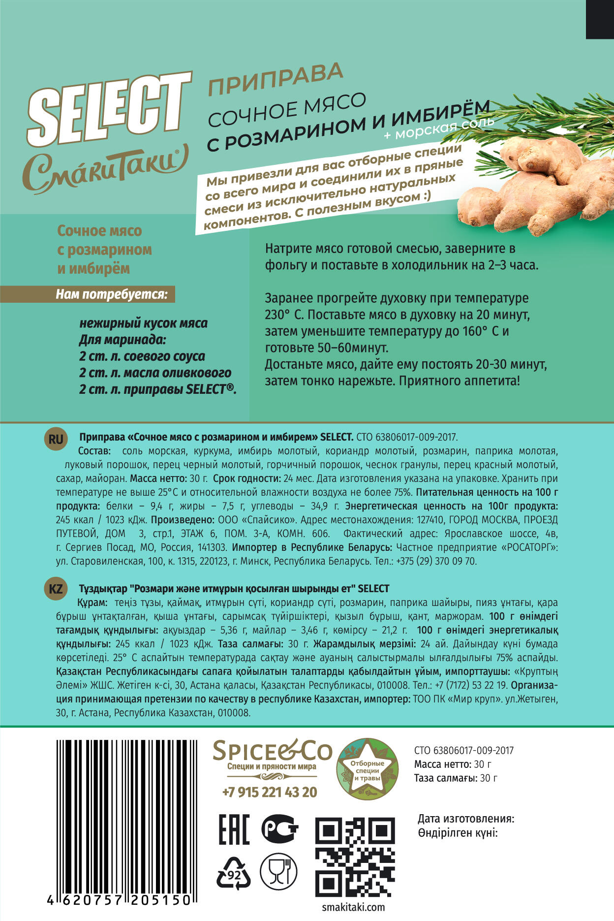 Состав: соль морская, куркума, имбирь молотый, кориандр молотый, розмарин, паприка молотая, луковый порошок, перец черный молотый, горчичный порошок, чеснок гранулы, перец красный молотый, сахар, майоран. Питательная ценность на 100 г продукта: белки — 34 г, жиры — 7,5 к, утеводы — 349 г. Энергетическая ценность на 100г продукта: 245 ккал / 1023 кДж. Хранить при температуре не выше 25°С и относительной влажности поздуха не более 75%.